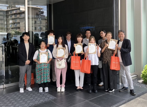 ディプロマを手に中野製薬株式会社玄関前での記念撮影の様子