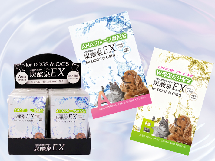 温浴メニューに活用できます!「心地よい炭酸泉浴で、皮膚・被毛をすこやかに」と訴求できます。二包式の粉状の炭酸泉なので、店頭販売商品としても活用することが出来ます。