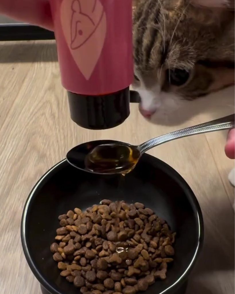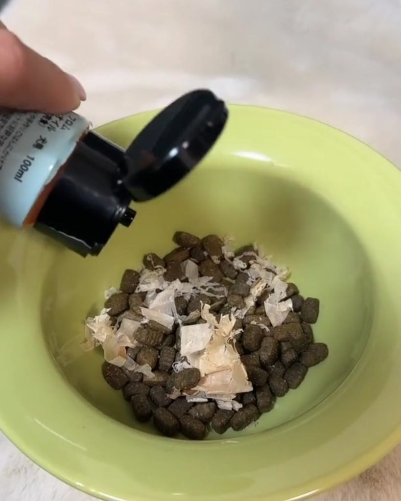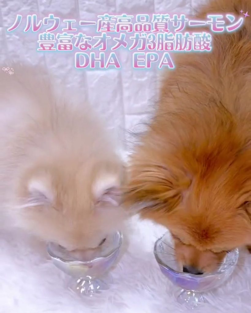 サーモンオイル単品で試食する様子を投稿していただきました。動画内では、ちゃちゃまるちゃんとBeeちゃんが、お皿がピカピカになるまでペロペロしてくれています。
