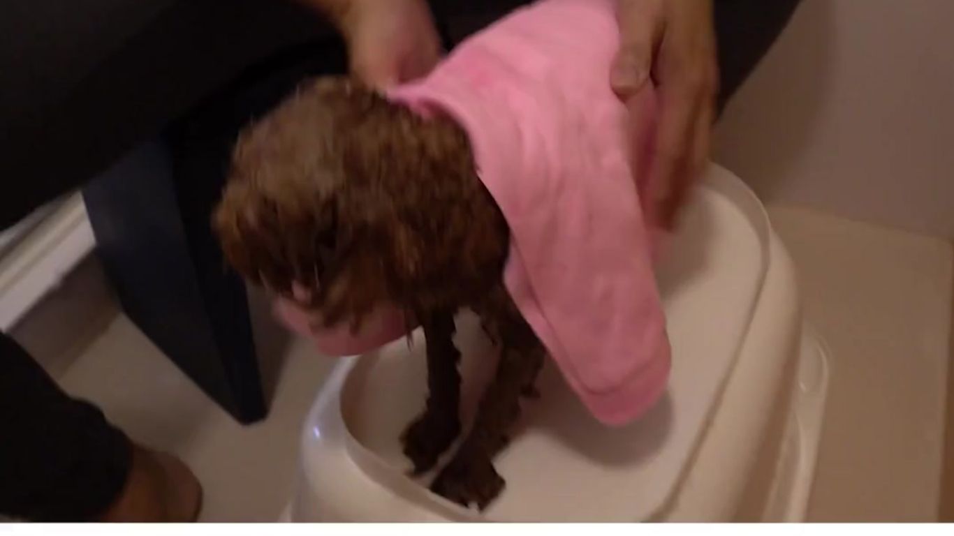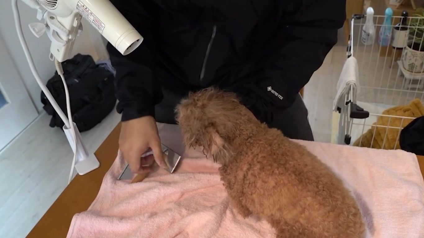 ガシガシと勢いよく拭いてしまうと、被毛同士がこすれ合い、被毛が絡む原因となります。吸水タオルで水分を優しく押さえるように、摩擦に注意して拭きましょう。ある程度、水分を拭き取れたらタオルで拭き上げます。タオルでしっかりと水分を拭き取らないと、のちのドライイングでなかなか乾かずに、わんちゃんが疲れてしまいます。タオルで丁寧に拭き上げましょう。