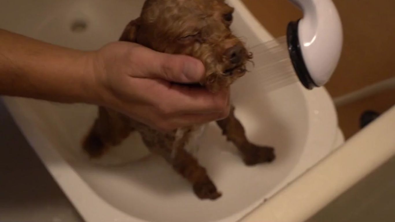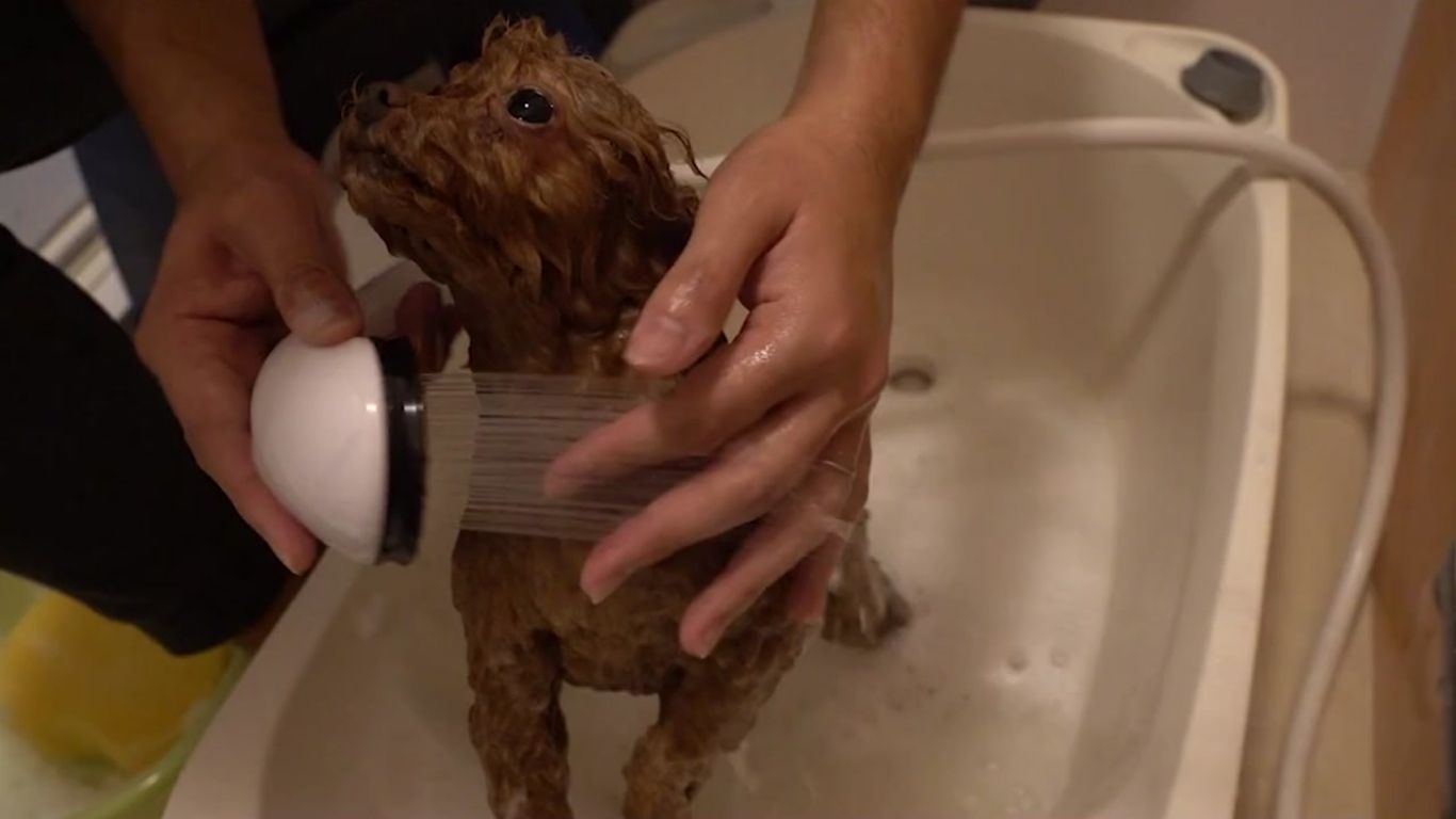 お湯をいきなり頭からかけるとわんちゃんがびっくりしてしまうので、足元やお尻から少しずつ濡らしましょう。シャワーの音が怖い仔もいるのでシャワーヘッドとわんちゃんの体をくっつけるとより良いでしょう。飼い主さまがやさしく声をかけてあげるとわんちゃんは安心します。
