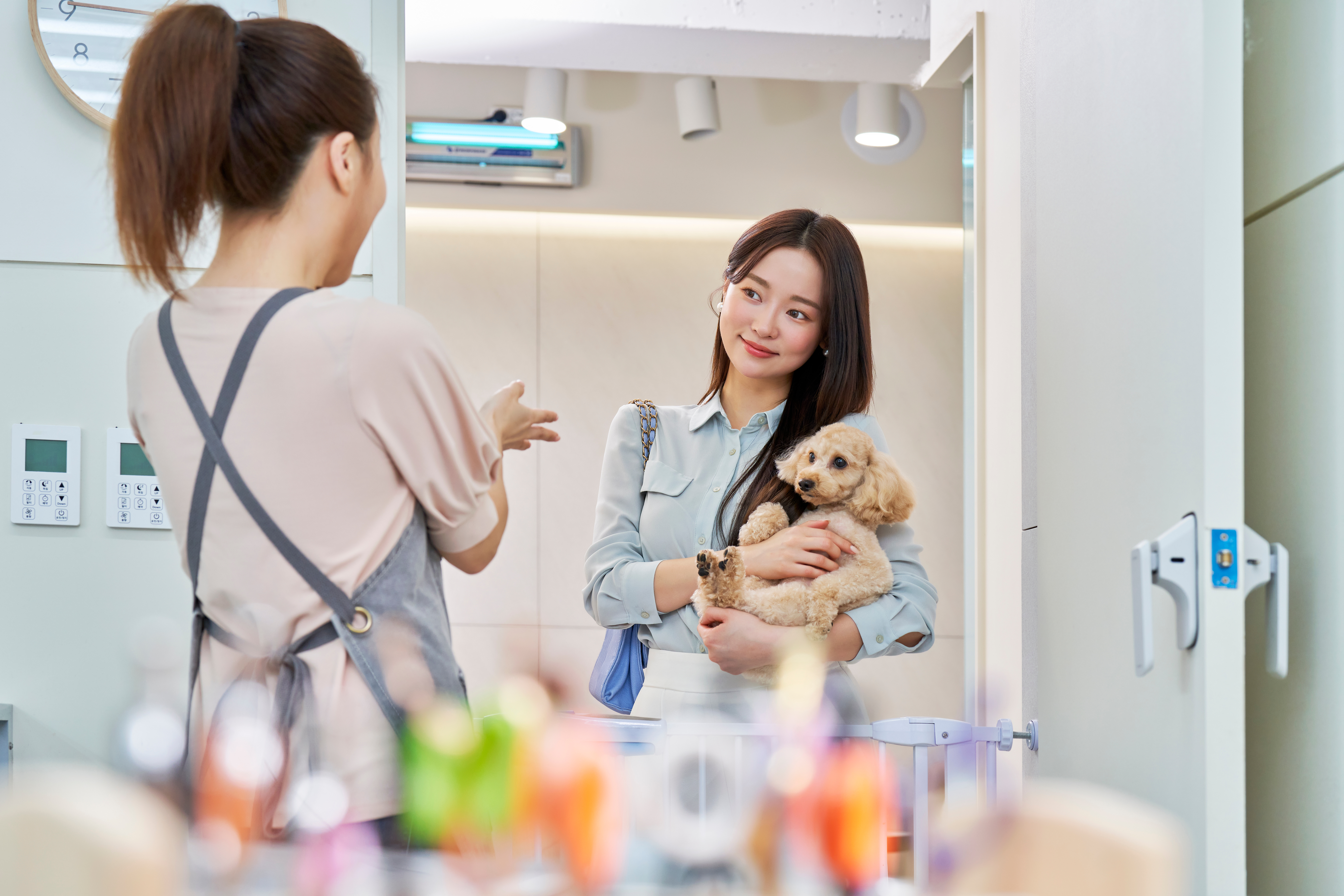 ペットサロン利用中の飼い主さまは送迎時の「待ち時間」に店内を見渡しています。