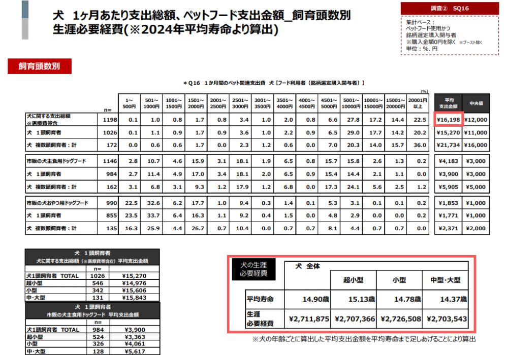 公益社団法人ペットフード協会が毎年発表している「飼育実態調査」によれば、2024年の犬1頭あたりの平均生涯飼育費用は約270万円。