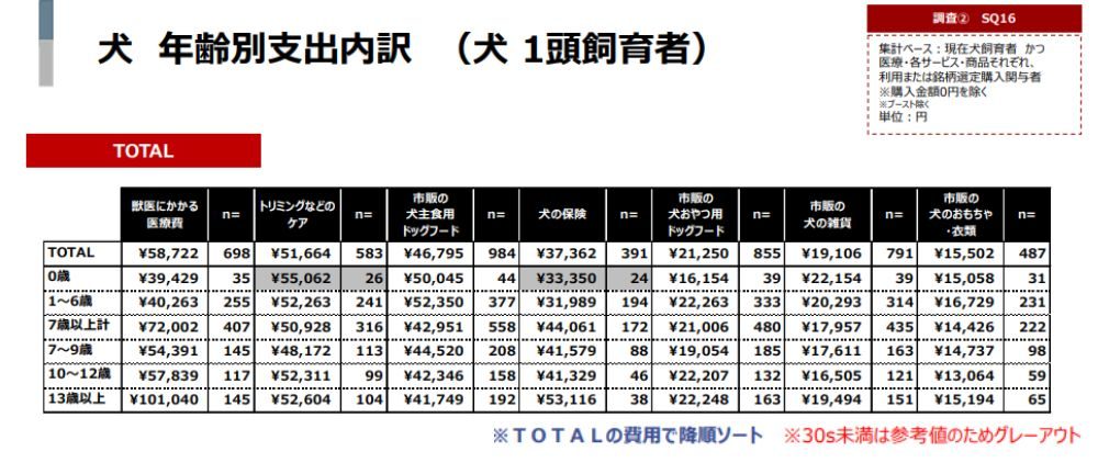 子犬期は、ワクチン・去勢避妊手術などの費用が集中します。成犬期は、比較的安定しますが、食事・日用品の支出が継続します。シニア期になると、医療費や療法食の比率が急増する可能性があります。